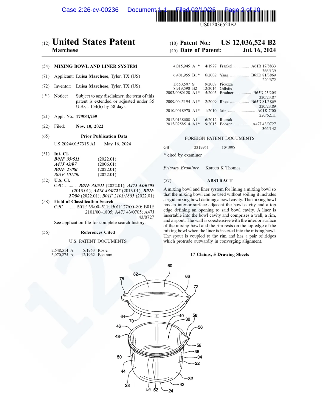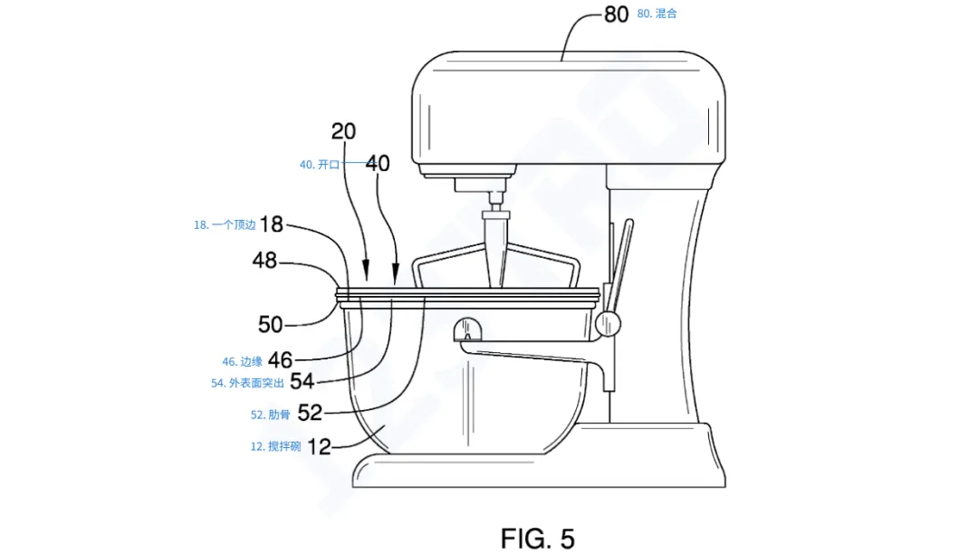 涉案专利于24年7月16日下证,主要保护是一款搅拌碗及衬垫系统,该系统必须同时包含刚性搅拌碗、可插入式衬垫、弹性柔性盖子三大核心部件