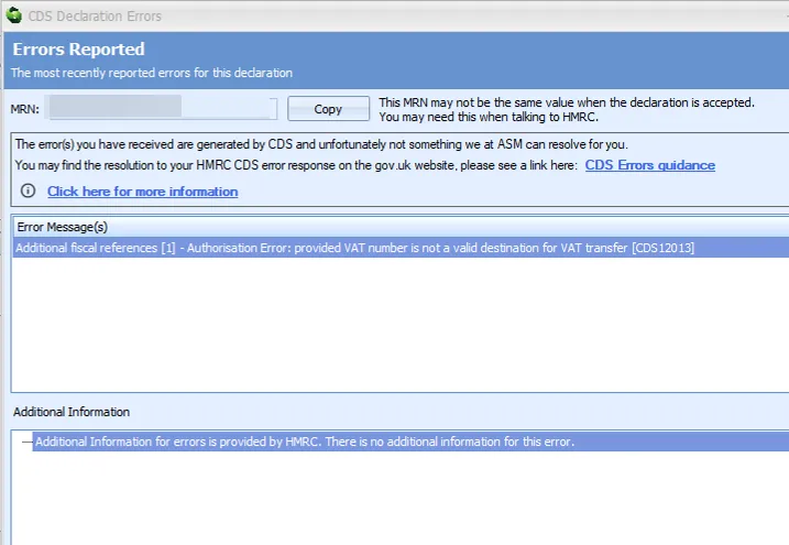 ② CDS12013 – Authorisation Error: provided VAT number is not a valid destination for VAT transfer