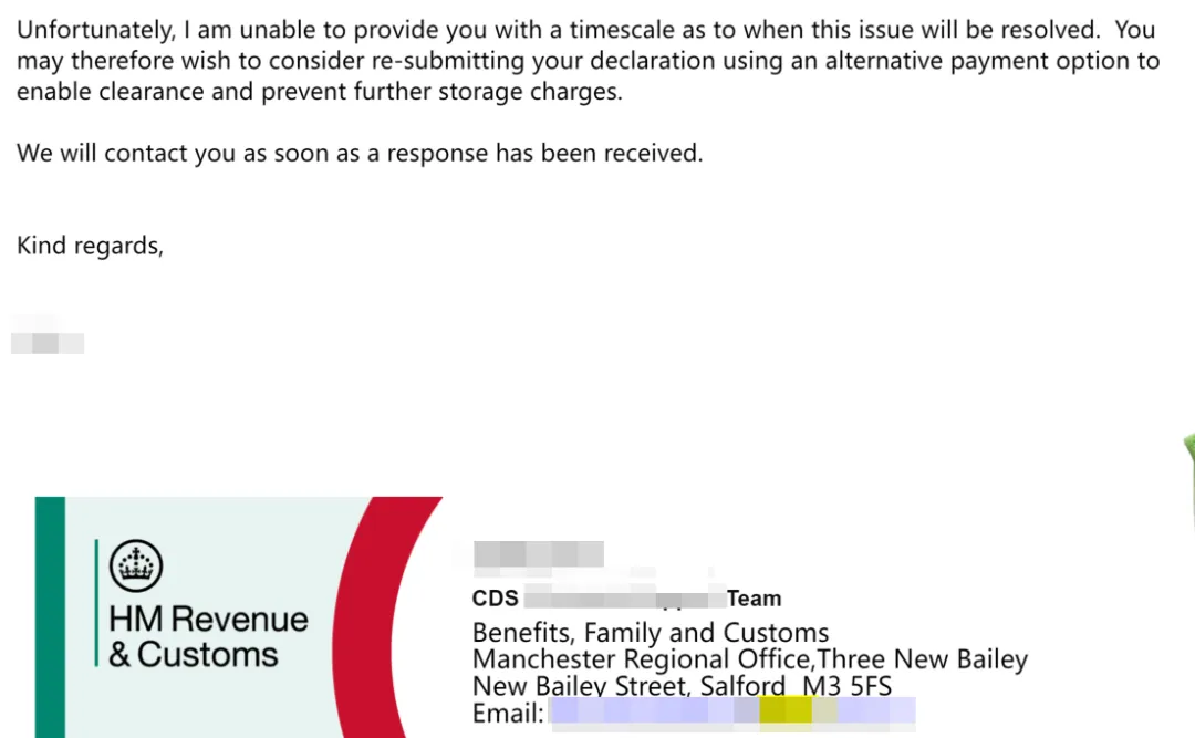 一般来说修复时间1-2周就可以解决,但HMRC无法承诺具体时间,所以如果您的货物已经抵达海关为了避免产生额外费用,可以考虑第二个方案。