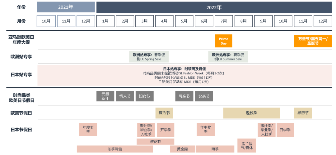 有些卖家会想,对于时尚品类,尤其是时装,季节性很强,我怎样去备货呢?没关系,亚马逊针对时尚品类卖家专门提供了一个时尚品类的全年备货图。不仅如此,这里还附上了一幅百宝图,就是热门站点的大小节假日包括促销季。有需要的卖家请自行提取。