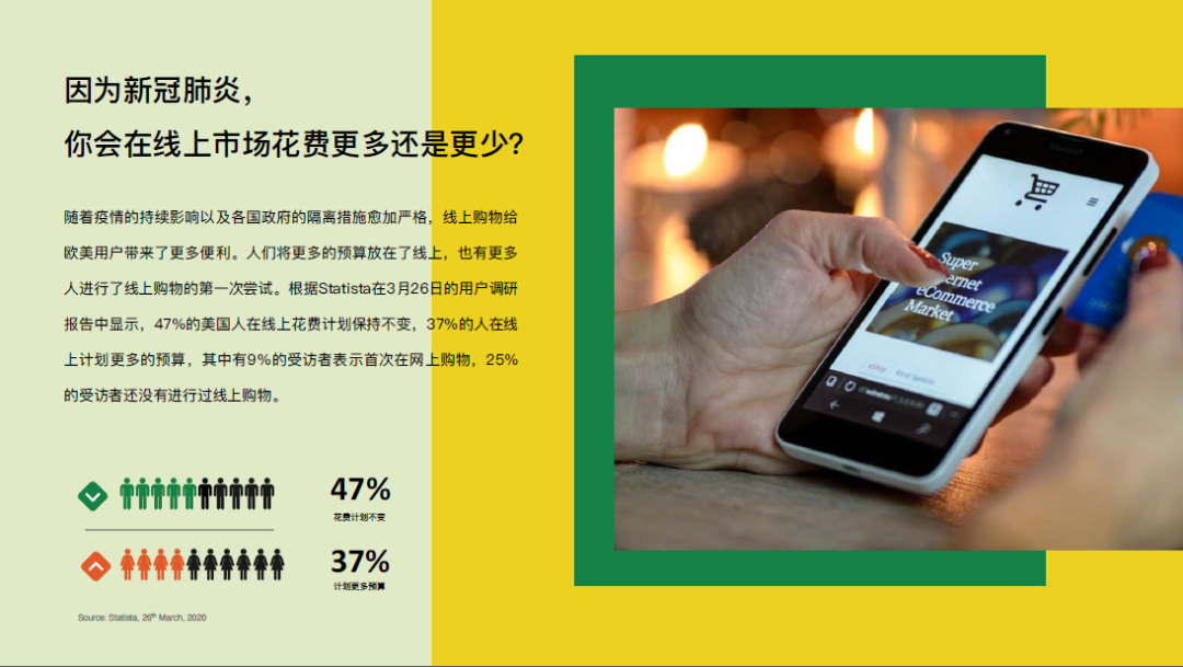 Statista在4月的调查发现,美国消费者在疫情下有超过37%的用户表示会在电商上花更多的钱,有47%的用户表示不会改变自己的消费计划。