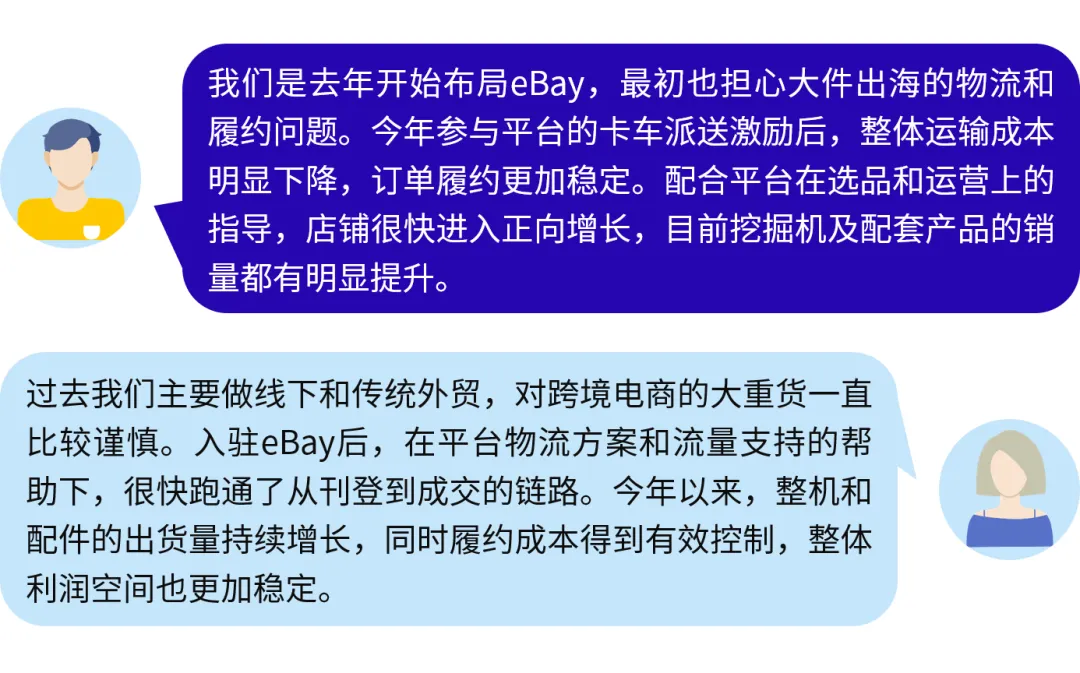 我们本身具备成熟的制造基础,但大重货跨境一直受限于物流难、门槛高。感谢eBay为我们工程机械品类量身定制了高效物流解决方案,搭配从选品到运营的全链路专业指导,再加上今年推出的专项卡派激励,帮我们降低了履约成本,出海效率大幅提升。现在我们的挖掘机、装载机远销美国,跨境业务实现大幅增长。
