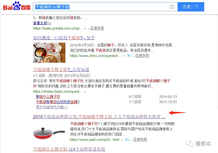 打开百度,搜索“平底锅什么牌子好”,我们发现靠前的内容就是典型的电商导购站。这个逻辑跟谷歌内做affiliate导购站如出一辙。