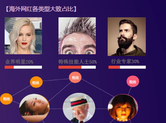【海外红人 】:与国内红人相对,海外网红是指在海外具有一定社会影响力的意见领袖或意见群体,其因某个事件或者某个行为而被网民所认可关注,或是长期持续输出某类专业知识而被网民持续关注。这类人群往往会被网民模仿起行为。