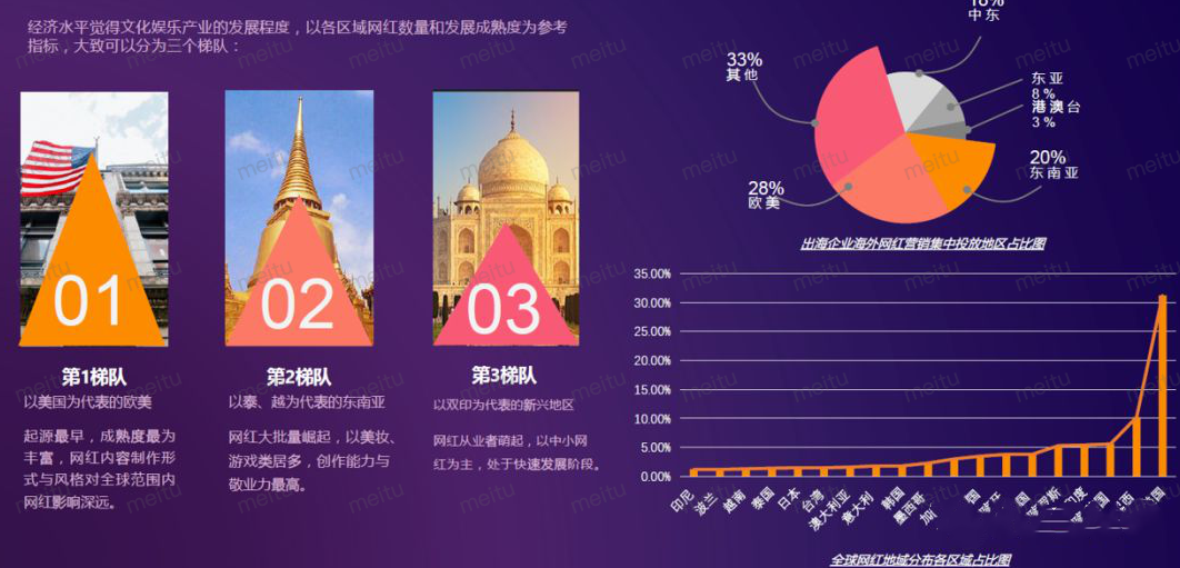 海外红人因经济发展成熟度不同,呈阶梯状分布