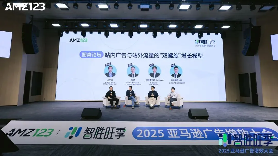在会议尾声,我们还特别设置了圆桌环节,James、陈肆、跨境毒舌说-Jackman以及聊跨境的大雄共同探讨了如何实现 TikTok、YouTube、Facebook 等平台与亚马逊站内广告的有机联动,并分享了在流量整合、广告优化、风险控制及效率提升等方面的实战经验与策略见解。