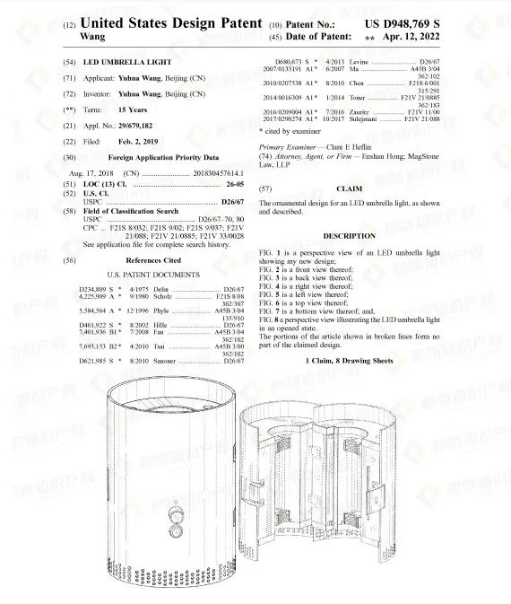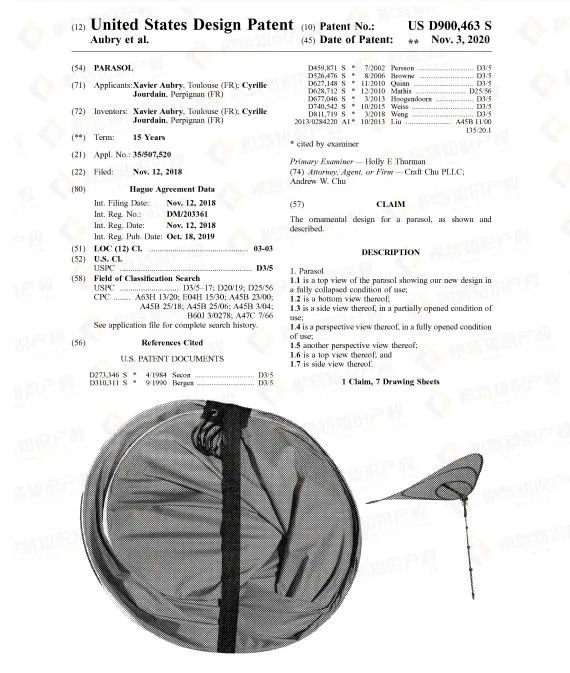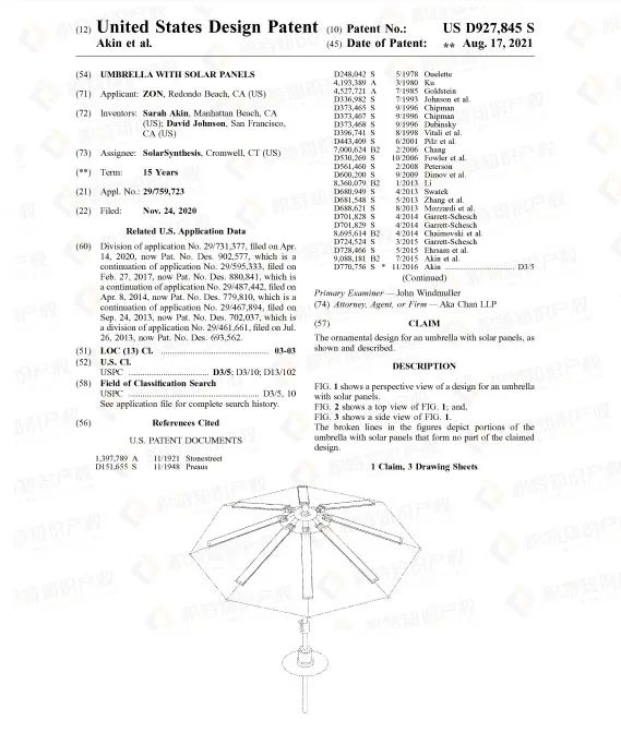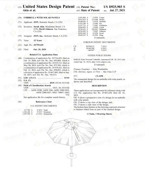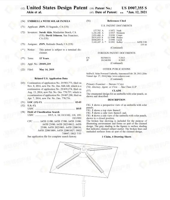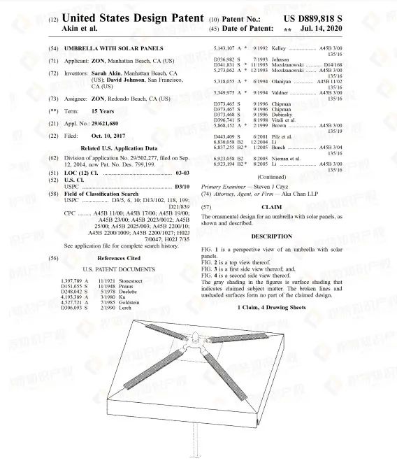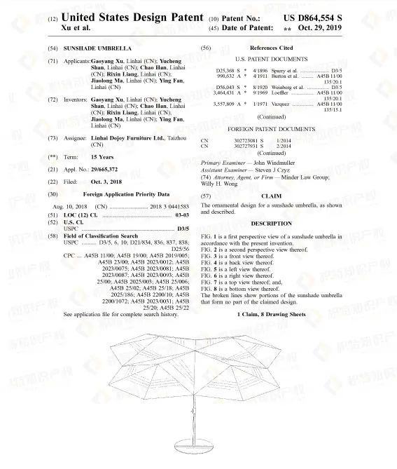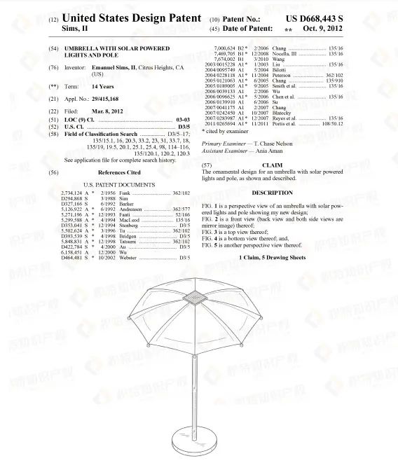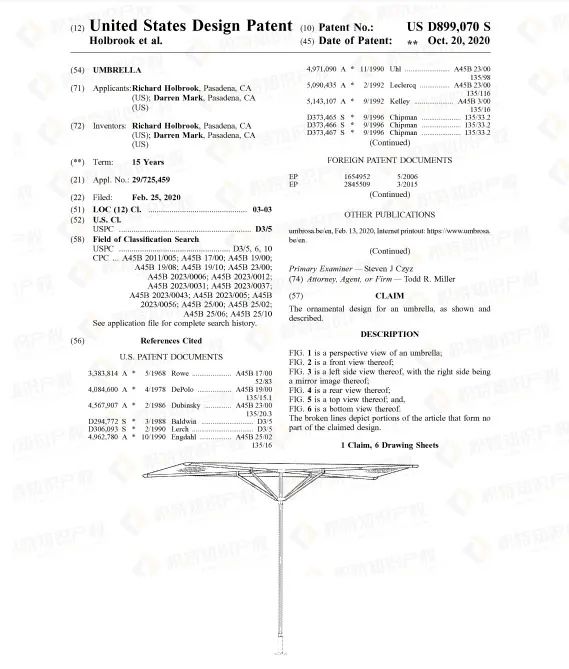 另外,除了安全问题,侵权问题也不容小觑。查询发现,不少户外遮阳伞产品都已申请外观专利,若是没有提前进行专利检索,很容易会踩中侵权坑!