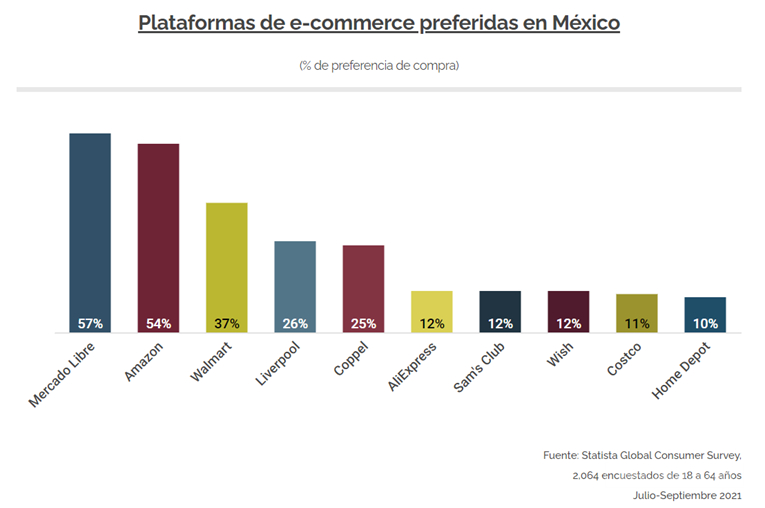 根据全球消费者调查报告,在2021年7月至9月之间,最受墨西哥用户欢迎的电商平台为美客多(Mercado Libre);第二为亚马逊墨西哥(Amazon Mexico);第三为沃尔玛墨西哥(Walmart de Mexico),其次为利物浦 (Liverpool)和科佩尔(Coppel)