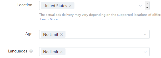 注意:为了获取更多的展示,建议您的语言定向及素材语言与所选地域主流语言保持一致。