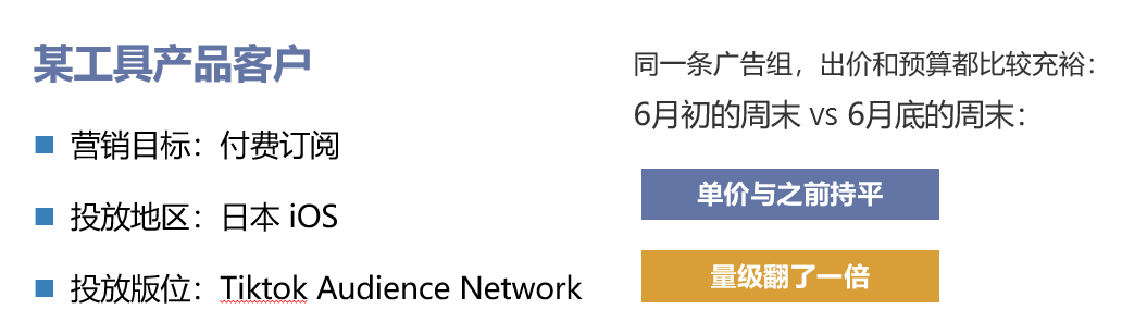 近期TikTok Audience Network接入了日本App store Top开发者流量,起量效果有了明显提升。