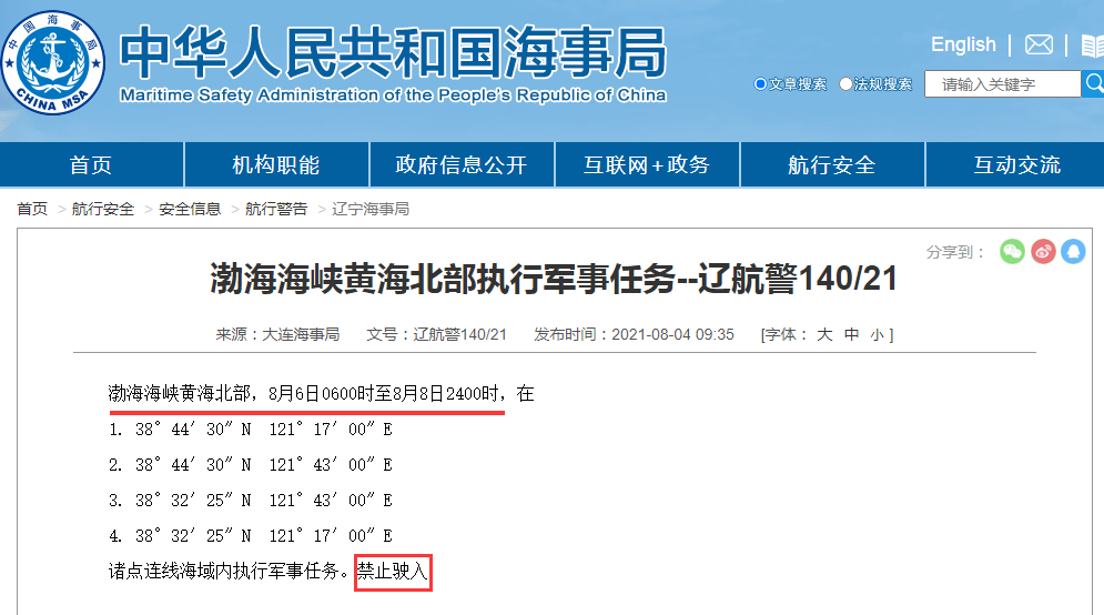 据大连海事局:渤海海峡黄海北部,8月6日0600时至8月8日2400时,在
