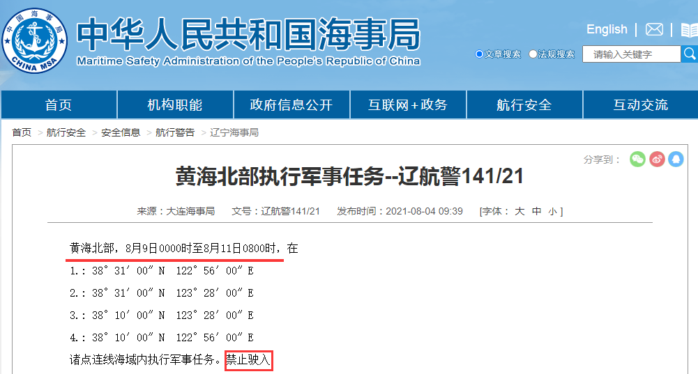 据大连海事局:黄海北部,8月9日0000时至8月11日0800时,在