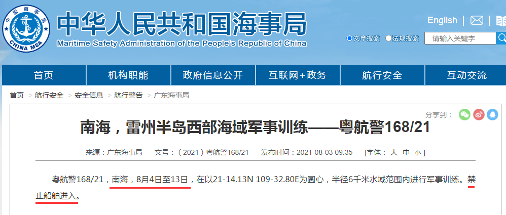 三、南海,雷州半岛西部海域军事训练--粤航警168/21