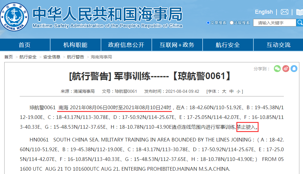 据海南海事局:琼航警0061,南海 2021年08月06日00时至2021年08月10日24时,在