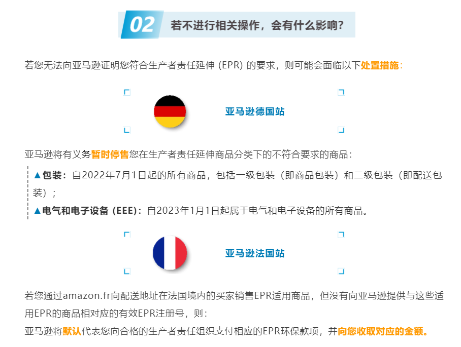 如果说卖家的确在德国和法国站点销售产品,但是你又没有注册EPR,那么将面临一系列的问题。