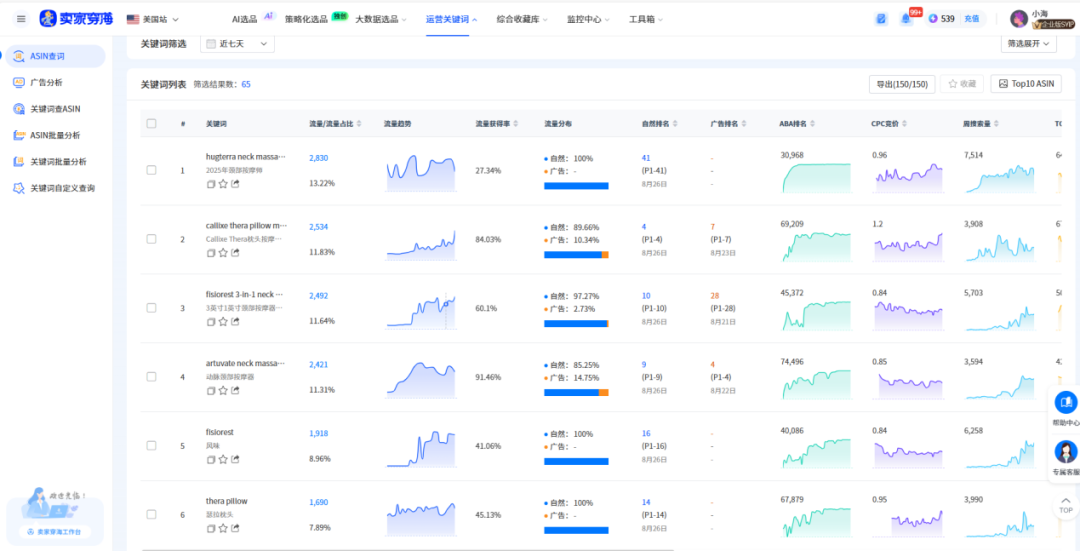 打开卖家穿海【ASIN查词】输入产品ASIN,就能发现找到ASIN近7天、30天的关键词列表;