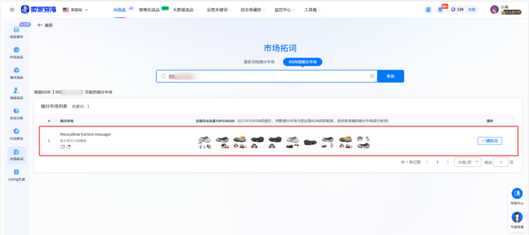 打开卖家穿海【市场拓词】找到你的ASIN所在的细分市场,这是个最快捷找到高相似竞品的方式;