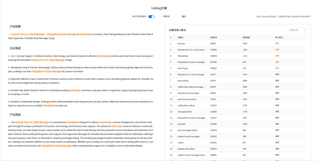 打开卖家穿海【Listing生成】功能,选择搭建好的词库并加入自己产品的ASIN,就能用AI一键生成一份新的Listing文案。