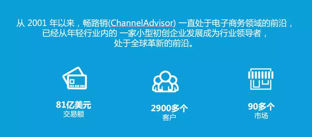 从 2001 年以来,畅路销(ChannelAdvisor) 一直处于电子商务领域的前沿,已经从年轻行业内的 一家小型初创企业发展成为行业领导者,处于全球革新的前沿。 [资料来源:TechValidate 调研 TVID: 296-E93-E11]