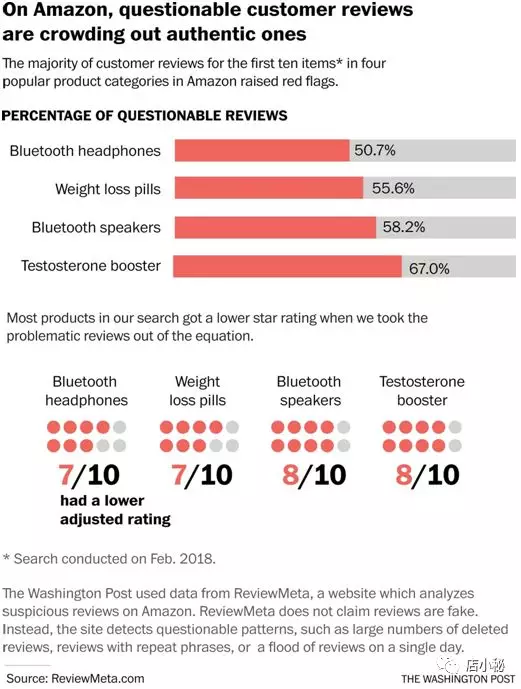 ReviewMeta审查了亚马逊Top10的蓝牙音箱,总共有47846条review,其中2/3是有问题的。减肥药和其他补充剂也有大量问题review存在。ReviewMeta数据显示,亚马逊网站中Top 10睾酮助推器的所有review中,只有33%是真实的,Top 10减肥药的review中,只有44%是真实的。