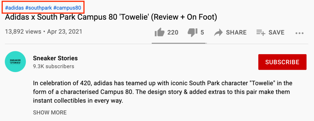 说明:红人为 YouTube 视频设置的话题(Hashtag),一般以显著的蓝色超链接形式,展现在视频与简介之间。