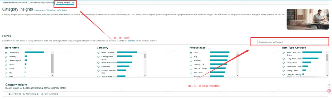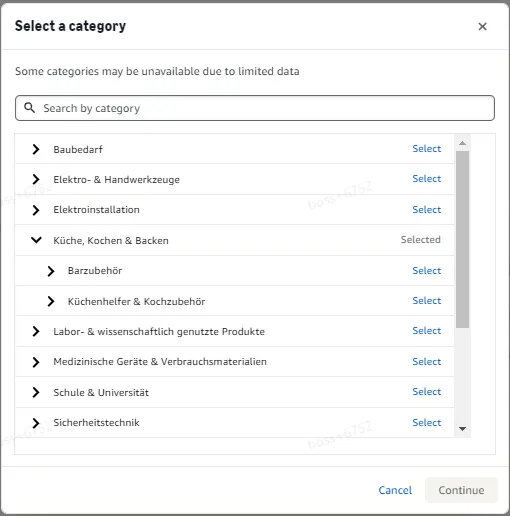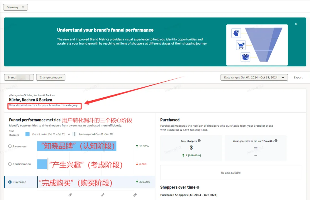 这里展示的是你的品牌在某某类目下的漏斗性能指标(案例类目是Küche, Kochen & Backen,老粉应该知道这不是我的类目,但我以这个为案例):指通过分析用户从“首次接触产品/品牌”(认知阶段)到“最终完成购买”(转化阶段)的整个流程中,各阶段(如浏览、加购、支付等)的转化率、流失率等数据指标,评估用户转化效率的工具。