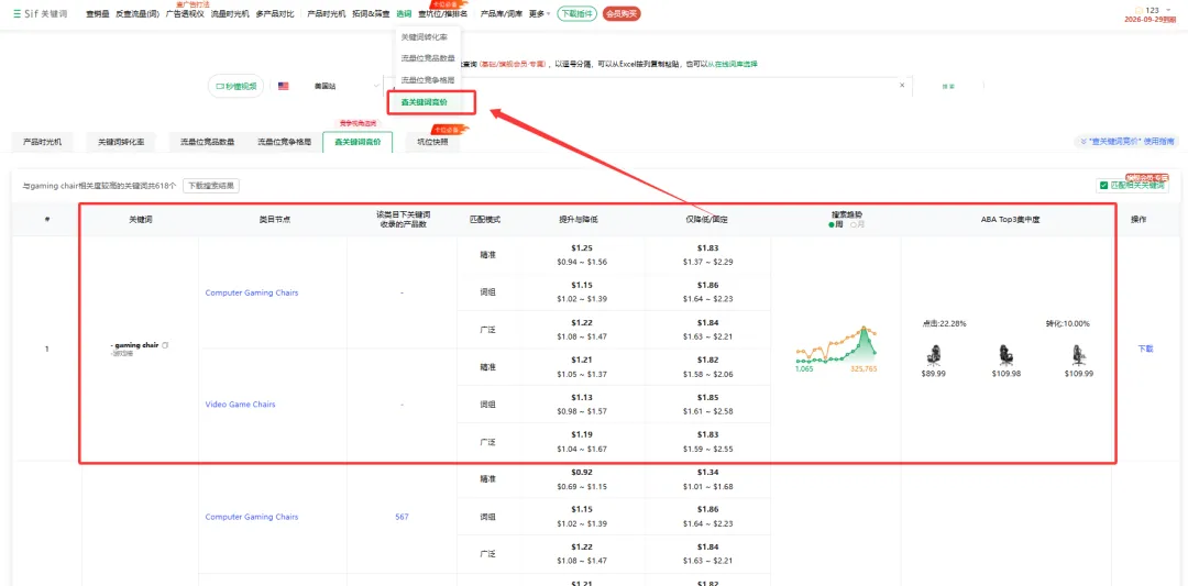 再细节一些,新品第一阶段先推什么关键词,建议使用SIF关键词工具的关键词转化率功能,这样可以快速了解到对应关键词的曝光、点击、CPA等数据