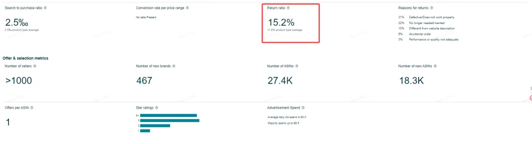 2. 产品评分:拉取类目平均评分(比如4.5分),如果你的产品评分长期在4.1分以下,且差评集中在产品本身(比如“质量差”“不好用”),后续推广会很难,建议及时止损。而在分析差评之前可以先从这两个方向去研究客户的反馈