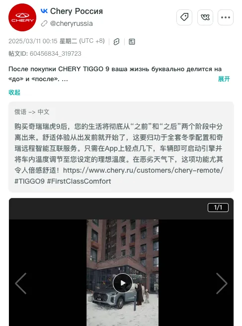 *通过OneSight营销云的监控功能,我们可以看到奇瑞在俄罗斯市场主流社交媒体平台VKontakte上设置了自己的品牌主页,并在帖文中强调在冬季恶劣天气下品牌的舒适性