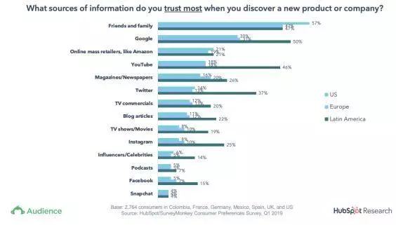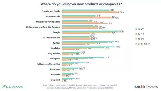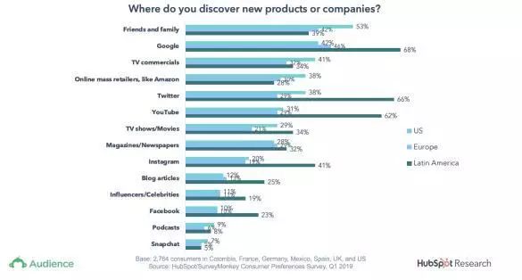 2019年初,数字营销公司HubSpot与网络调查平台SurveyMonkey合作开展了一项针对社媒用户和消费者购买偏好的研究。该研究借助问卷调查平台SurveyMonkey Audience就消费者如何购买产品展开调查,参与者包括哥伦比亚、法国、德国、墨西哥、西班牙、英国和美国在内的2700多名消费者。