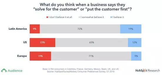 (图为企业声称“为客户解决问题”或“顾客第一”时消费者的内心想法,红色为我完全不相信,灰色为我有点相信,蓝色为我相信。)