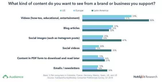 据HubSpot在2017年的一项调查,视频仍然是消费者了解企业的重要内容形式。令人难以置信的是,大多数地区与年龄层群体都有着这样的偏好(如下图)。