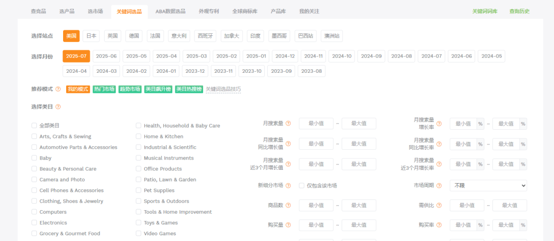 你可以用卖家精灵这类工具的【关键词选品】功能,几步就能找到潜力市场: