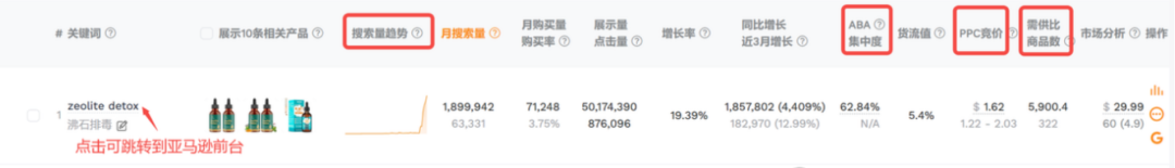 查看商品详情页:点关键词旁边的图标,看看实际竞品情况,比如评论数、生命周期、价格和差异化程度等等。