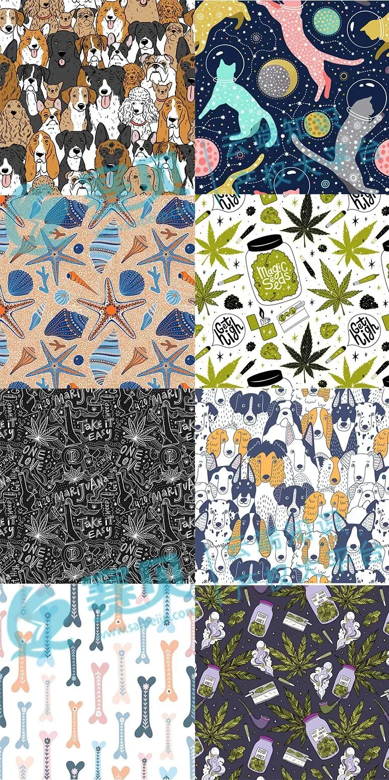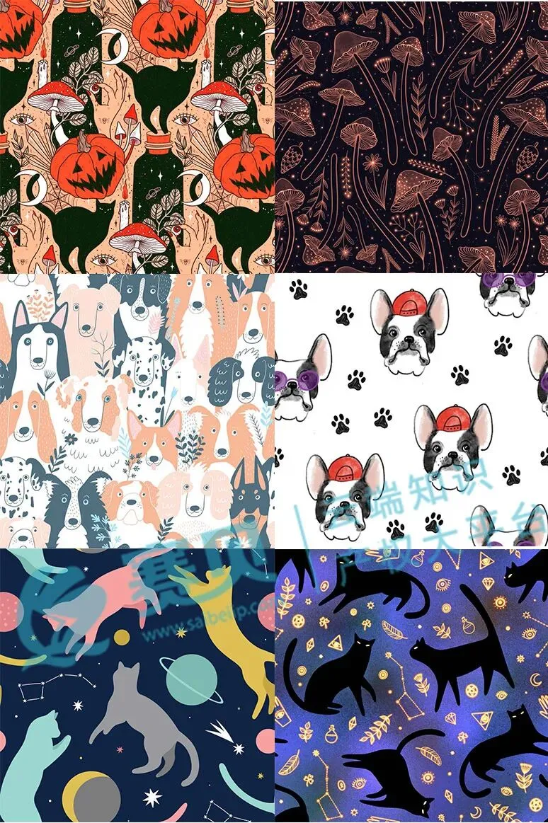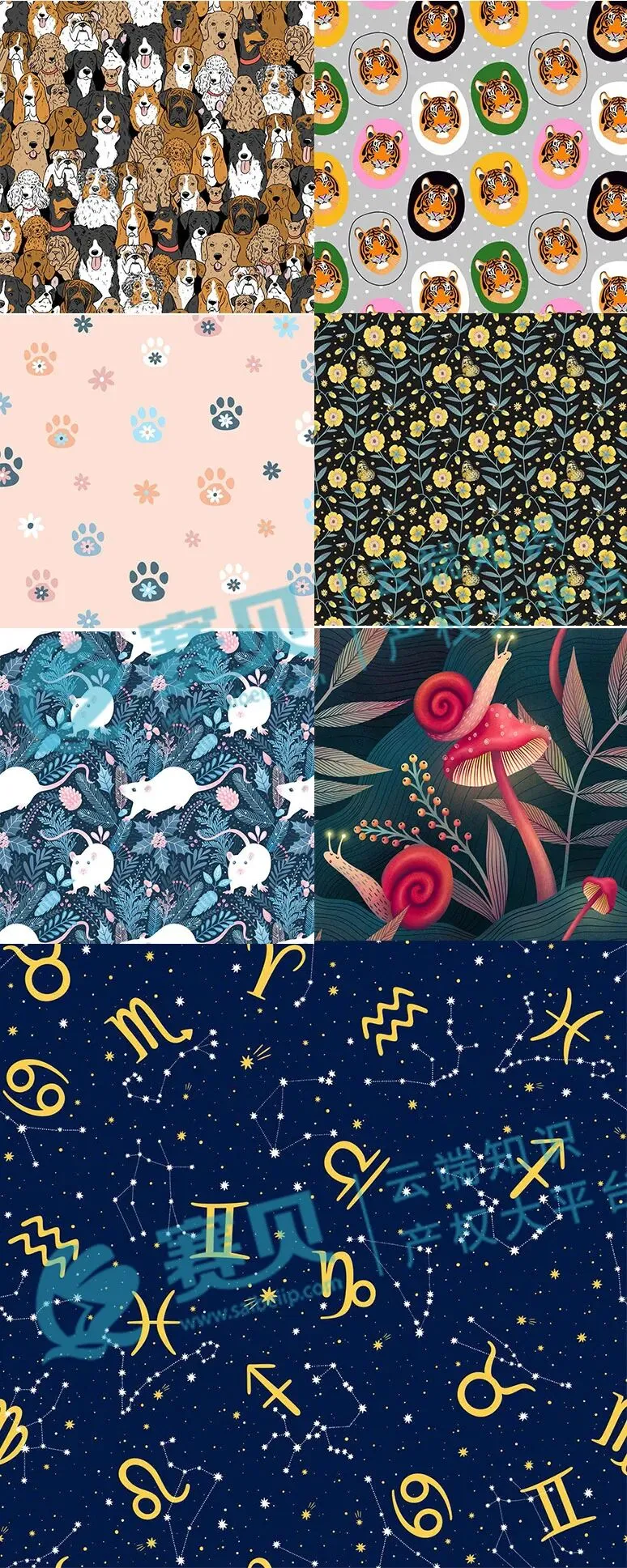 这次维权的是21项涵盖动物(狗狗、猫咪、老鼠等)、自然(花卉、蘑菇、星座)、节日(万圣节)及潮流(大麻元素)主题的无缝图案, 这些图案的应用场景特别广,像T恤/手机壳/家居装饰/文具/纺织品等产品上都可能用到。赛贝提醒,未经授权,请不要随意使用,容易触发侵权风险。