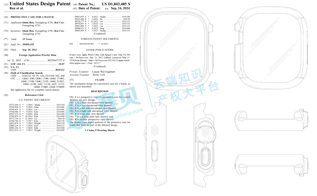 本案涉及的是原告共同拥有的美国设计专利USD1,043,405,专利名称为“PROTECTIVE CASE FOR A WATCH”(手表保护壳),申请日期为2022年9月29日,授权日期为2024年9月24日。