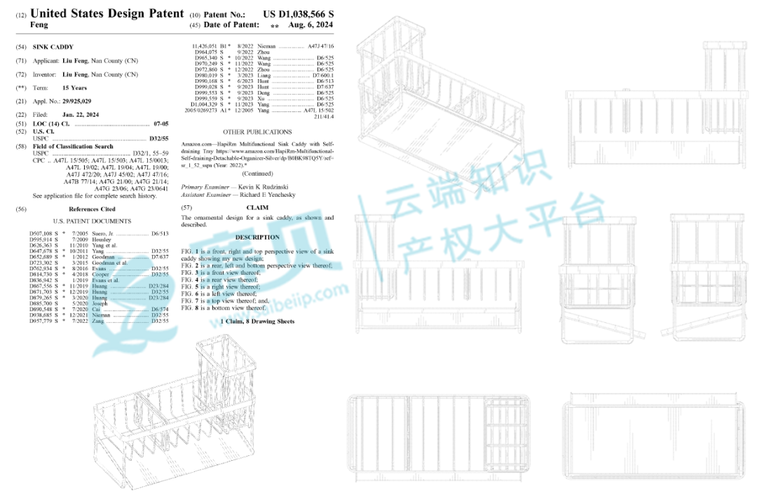 该案件涉及美国外观设计专利US D1,038,566 S,专利名称为“SINK CADDY”(水槽收纳架),申请日期为2024年1月22日,授权日期为2024年8月6日。