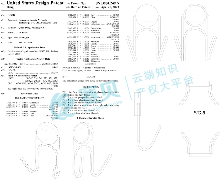 目前该案具体维权细节尚未完全公布,但赛贝检索到原告拥有三项美国注册外观专利,分别是US D984,249S、US D984,248S、US D1,005,088S,均在2023年获得授权。这三项专利均涉及钩子及金属钩子的装饰性设计。