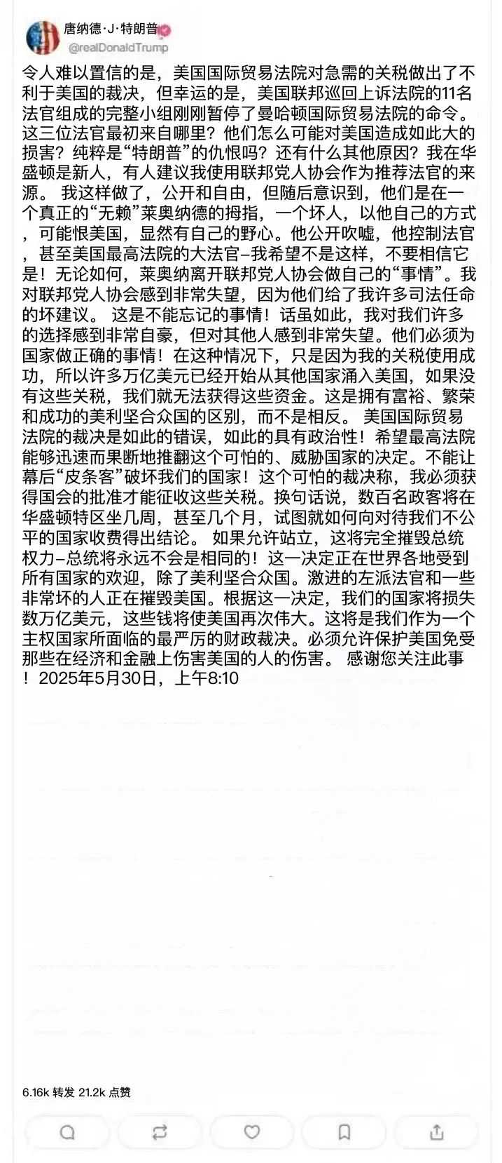 特朗普在社媒发长文: