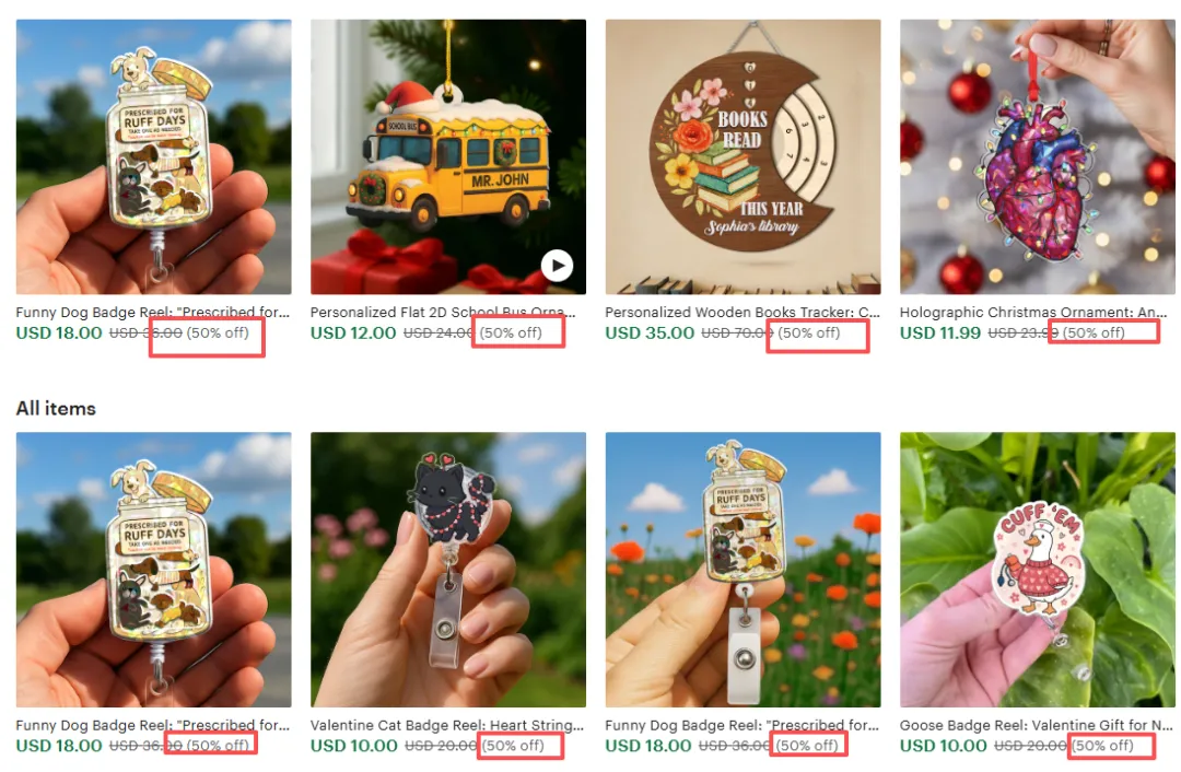 而且产品多还有个好处:被搜索到的机会大大增加。不管顾客搜“毕业礼物”还是“宠物纪念”,都可能找到这家店。