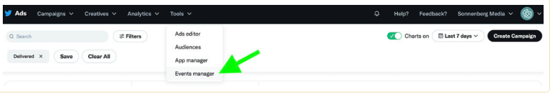 要设置或更新新的 Twitter 像素,首先打开 Twitter 广告管理器面板。打开工具下拉菜单并选择事件管理器。