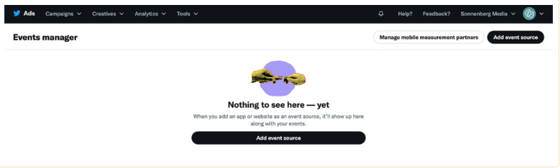 如果您之前从未设置过用于转化跟踪的 Twitter 像素,您将不会在事件管理器仪表板中看到任何内容。单击“添加事件源”按钮开始。