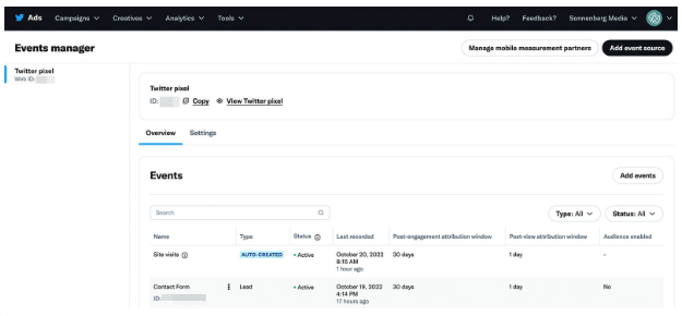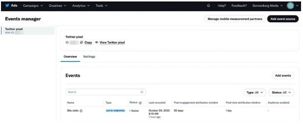 保存并安装代码后,您可以检查事件管理器仪表板中的事件列表,以确保事件得到验证。您当前正在跟踪的所有事件都应显示活动状态。继续添加您想要通过 Twitter 广告活动跟踪的所有事件。