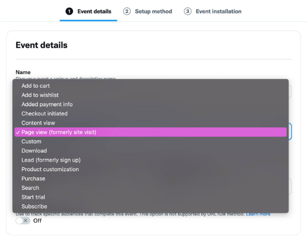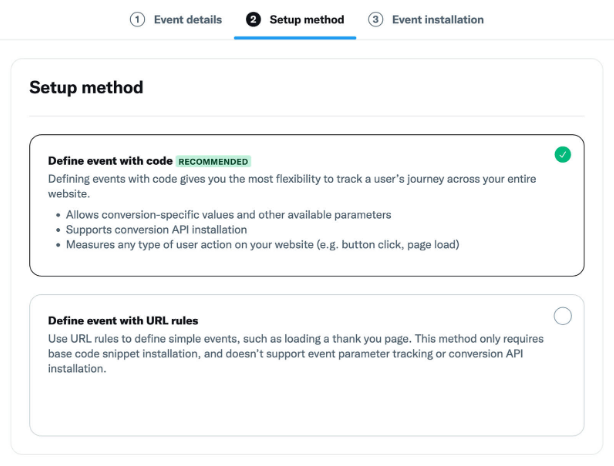 接下来,选择一种可用的设置方法。您可以在计划跟踪的页面上安装代码,也可以添加 URL 规则。Twitter 建议使用代码,因为它是最灵活的并且还可以与 Conversion API 一起使用。