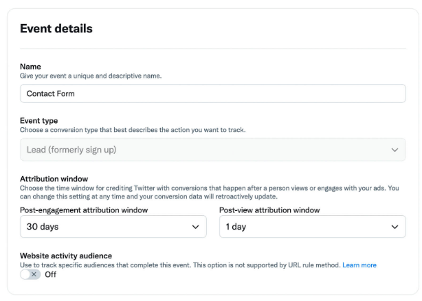 选择事件类型后,为其指定一个您可以在事件列表中轻松理解的描述性名称。然后查看归因窗口。您可以将参与后归因窗口和查看后归因窗口设置为 1 到 30 天之间的任何时间。