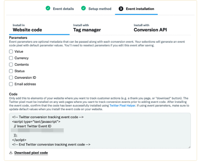 然后复制或下载安装代码,使用事件管理器中的说明进行安装。本质上,您需要将像素代码添加到网站所有页面的 <head> 部分。如果你已经有一个通用网络标签来监控你网站上的 Twitter 广告转化,请将其替换为新的像素代码。
