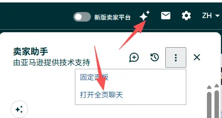 目前欧洲站显示为测试版,日本站暂时未上线该功能。在新版卖家平台找到“卖家助手” 入口,可选择固定面板或打开全页聊天模式。