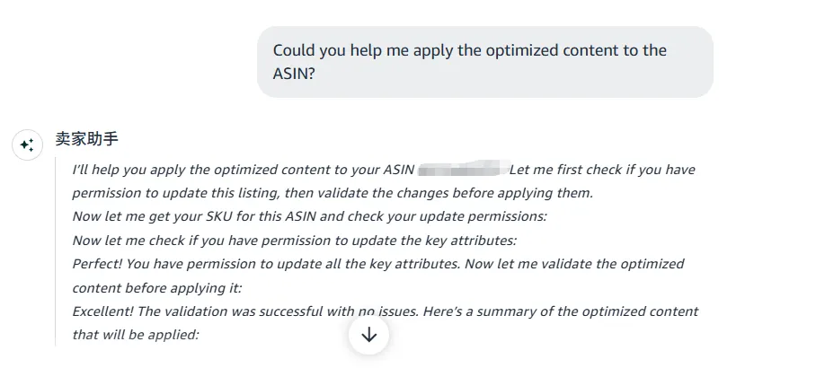 发送指令“帮忙将优化内容应用到 ASIN 上”,工具会先检查账号的更新权限,再验证优化内容的合规性。验证通过后会给出优化内容摘要,卖家确认无误后点击 “Approve”,即可完成 Listing 的自动更新。