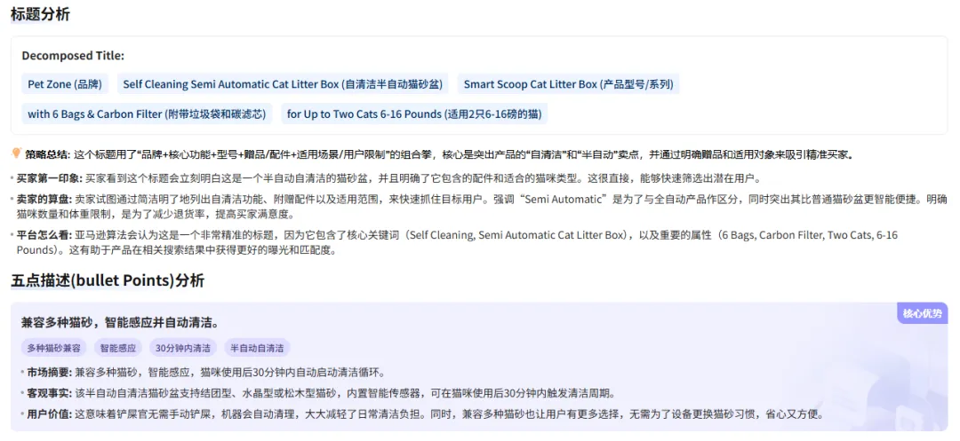 聚焦标题和图片给买家的第一印象,判断其是否能快速传递核心价值。以一款猫砂盆产品为例,其标题结构为“品牌 + 核心功能 + 型号 + 赠品 / 配件 + 适用场景 / 用户限制”。买家看到后能立刻明确产品是半自动自清洁猫砂盆,知晓附带配件和适用猫咪范围,可快速筛选出精准用户。反观自身链接,需要判断标题是否简洁易懂,图片是否直击买家痛点。