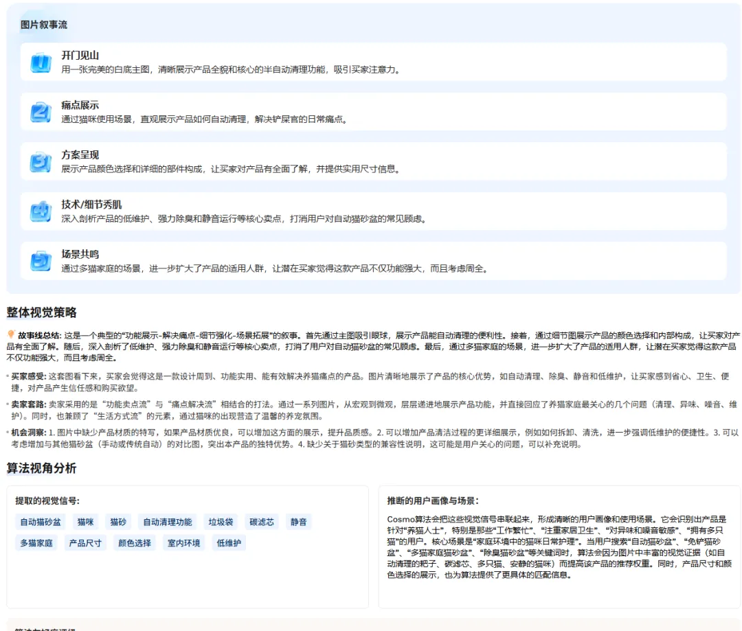重点看标题的关键词布局和图片的视觉信号是否符合算法偏好。算法会抓取标题中的核心关键词,以及图片中的产品功能、使用场景等视觉信息。还是以猫砂盆为例,其图片依次展示了白底主图、猫咪使用场景、产品颜色和部件、核心卖点细节、多猫家庭场景。这些视觉信号会被Cosmo 算法串联,形成 “工作繁忙、注重家居卫生的多猫家庭铲屎官” 的用户画像。当用户搜索相关关键词时,算法会因丰富的视觉证据提高产品推荐权重。我们优化时需要确保标题关键词前置,图片包含足够的功能和场景信息,与算法的匹配逻辑对齐。